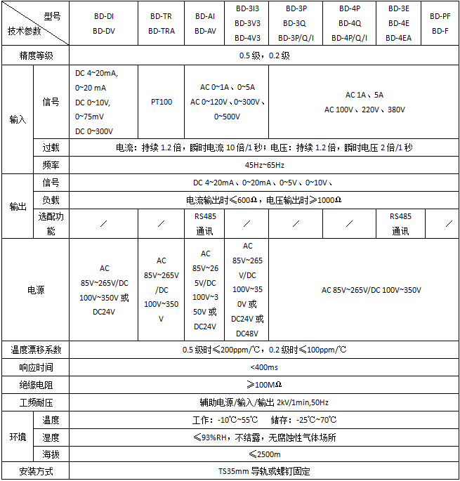 | 電壓變送器 | BD-AV | 測量單相交流電壓,隔離變送輸出4-20mA或0-5V DC信號 | RS485-MODBUS |