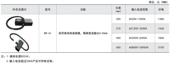 | BR-AI | 采用真有效值測量, 隔離變送輸出4-20mA | 350 | AC200-1000A |