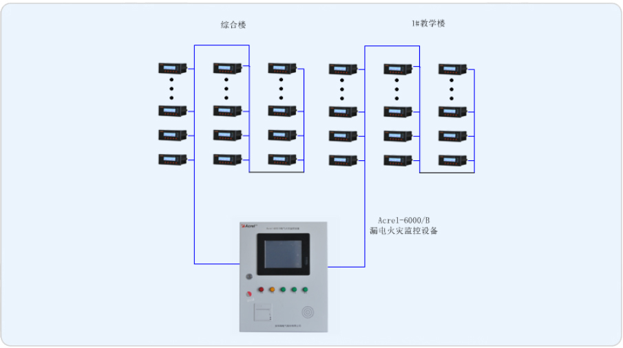 本項目主要是針對上海復旦高等藝術實訓基地內的兩棟教學樓設計電氣火災監控系統。在部分樓層配電柜的重要回路安裝安科瑞研發的ARCM系列剩余電流式電氣火災監控探測器,并為其配置一套Acrel-6000/B電氣火災監控系統,電氣火災監控系統實時監測重要回路的剩余電流值、箱體回路的實時溫度,監測的數據實時傳輸至后臺主機,當發生剩余電流值越限、溫度越限時,后臺能進行聲光報警,同時后臺能夠和消防火災報警系統實現消防聯動。