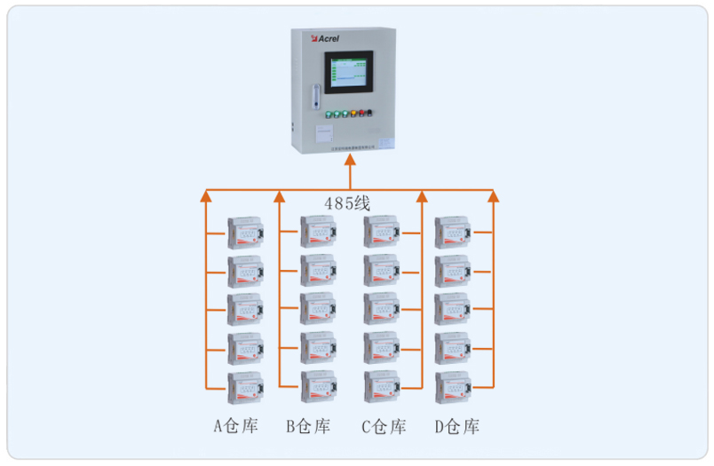 系統(tǒng)采用安科瑞消防電源監(jiān)控系統(tǒng),該系統(tǒng)主要采用分層分布式網(wǎng)絡(luò)結(jié)構(gòu),系統(tǒng)結(jié)構(gòu)為:站控管理層、網(wǎng)絡(luò)通訊層和現(xiàn)場設(shè)備層。其中廣陳第三方電子商務(wù)平臺托管產(chǎn)業(yè)基地現(xiàn)場設(shè)備分布為A、B、C、D倉庫以及綜合辦公用房消防配電回路。該系統(tǒng)監(jiān)控所有消防配電柜內(nèi)消防回路雙電源的實(shí)時運(yùn)行狀態(tài),如有異常會后臺報警。所有監(jiān)測模塊通過485總線鋪設(shè)至消防控制室,消防電源監(jiān)控主機(jī)從而完成對監(jiān)測模塊的采集并監(jiān)控。