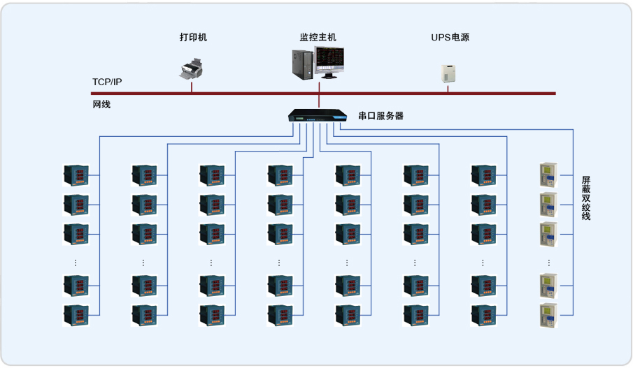Acrel–2000軟件通過中間采集設(shè)備采集現(xiàn)場電力監(jiān)控儀表數(shù)據(jù),并在系統(tǒng)一次圖顯示出來。主要實(shí)現(xiàn)功能如:遠(yuǎn)程抄表查,詢各個(gè)配電室各個(gè)回路按照時(shí)間段進(jìn)行歷史數(shù)據(jù)查詢。趨勢曲線,功率實(shí)時(shí)趨勢顯示及歷史趨勢查詢功能。系統(tǒng)遙信狀態(tài)報(bào)警,根據(jù)本系統(tǒng)的設(shè)計(jì)意圖,如果重要回路或者照明回路三相中某一相電流負(fù)荷超過額定值的90%,系統(tǒng)必須立刻發(fā)出聲光報(bào)警并彈出指示框指明報(bào)警源,提醒管理人員注意負(fù)載的三相平衡和負(fù)載率,同時(shí)自動(dòng)記錄事件發(fā)生的時(shí)間和回路名稱,以便用戶查詢,追憶故障原因。