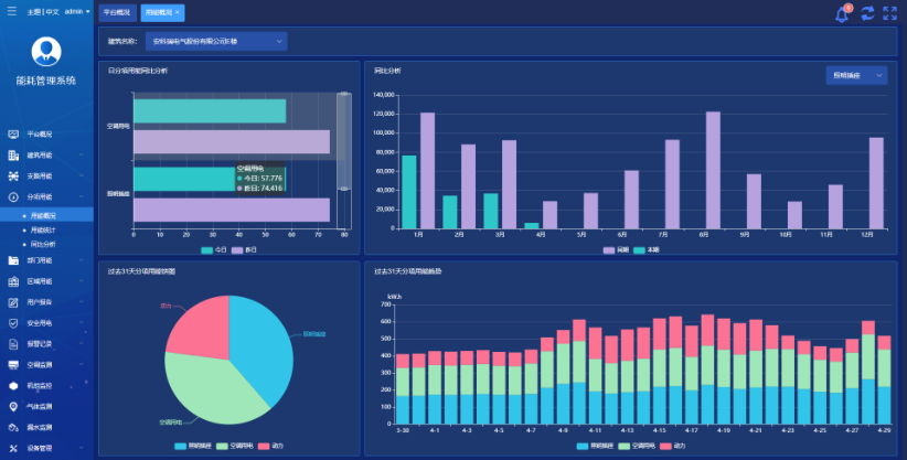 提供能耗分析報(bào)告功能,從多個(gè)維度統(tǒng)計(jì)分析用戶能耗使用情況。報(bào)告可以提供同環(huán)比分析、復(fù)費(fèi)率電量和電費(fèi)分析、能耗排名分析、報(bào)警情況統(tǒng)計(jì)等功能。
