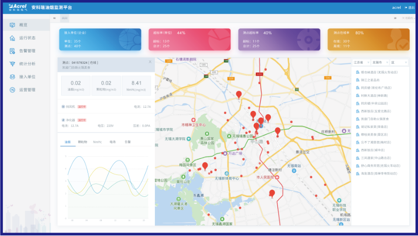 平臺GIS地圖采集餐飲油煙處理設備運行狀態和油煙排放的濃度數據,自動對超標排放及異常企業進行提示預警,可迅速進行處理,督促餐飲企業整改設備,并定期清洗、維護,實現減排環保,不擾民等目的。